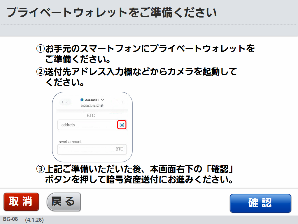 BTMに表示されるQRコードをスマートフォンで読み取り、暗号資産を送付します。STEP